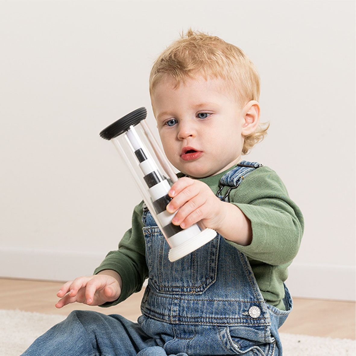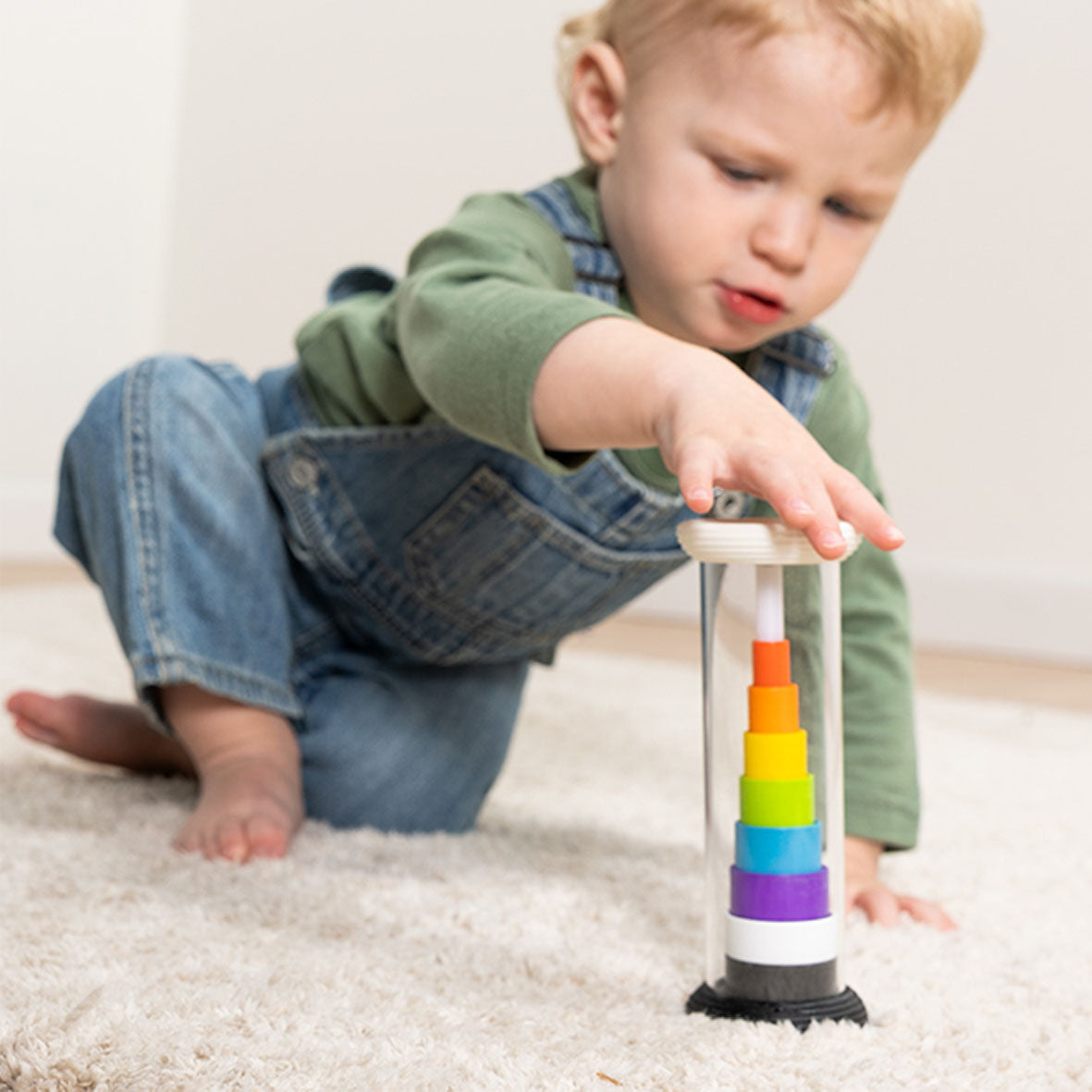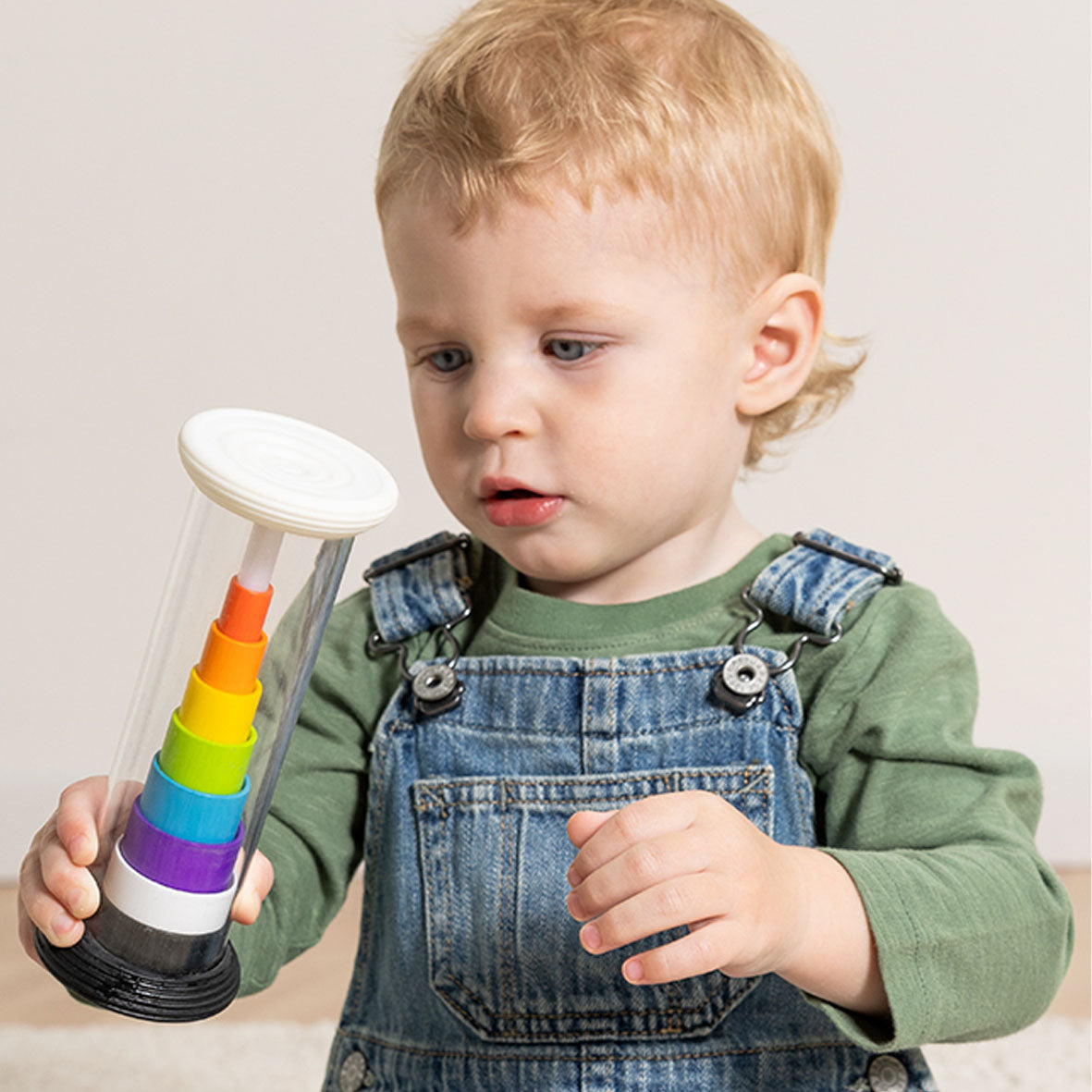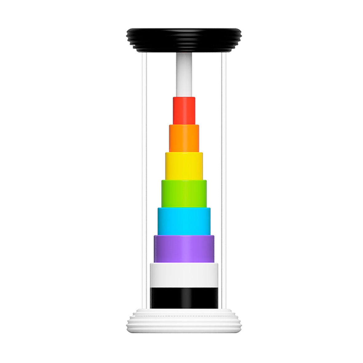 • Sensory toy with a stack of rings inside that flip from black-and-white to rainbow