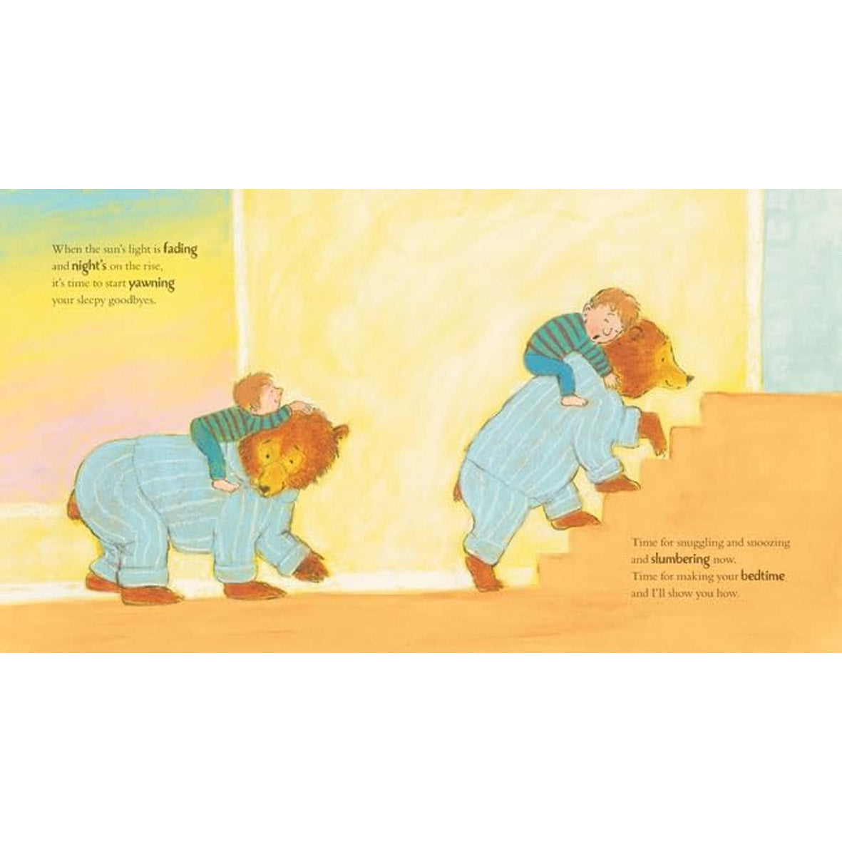 This sweet story celebrates the bonding rituals of bedtime. A sloshy bath, soft pyjamas, finding teddy, a song for singing, a huggily hug - and especially a story!
