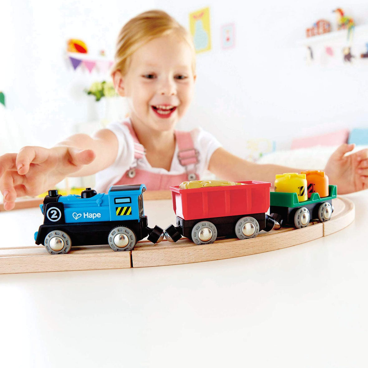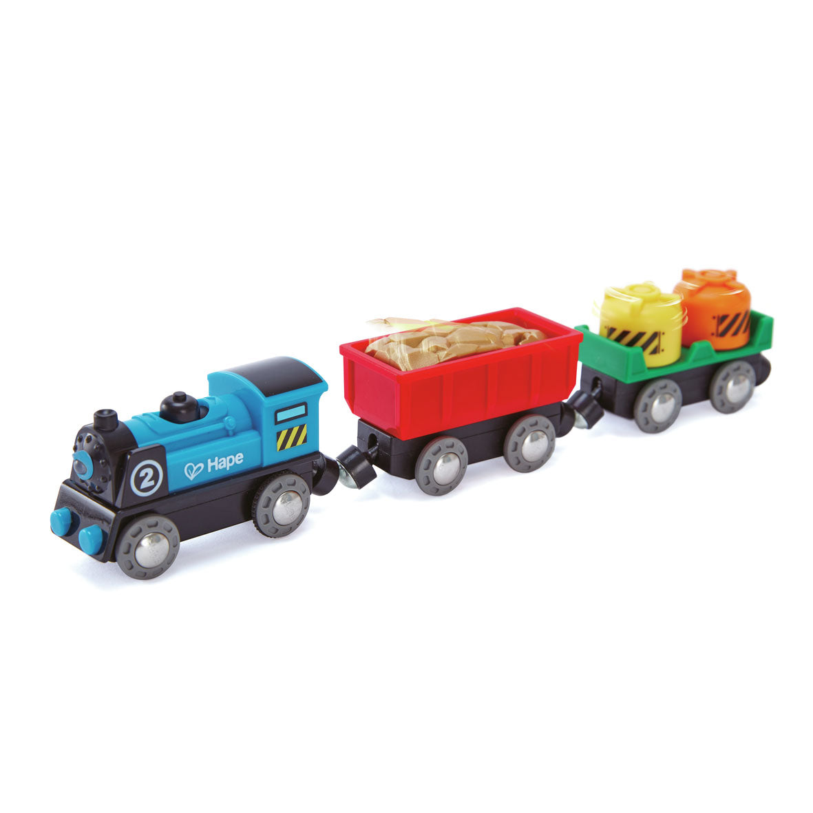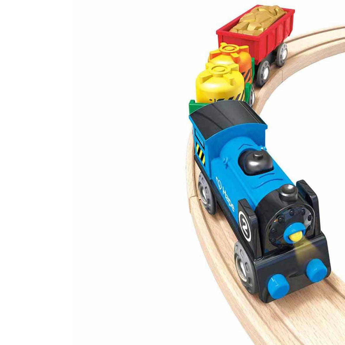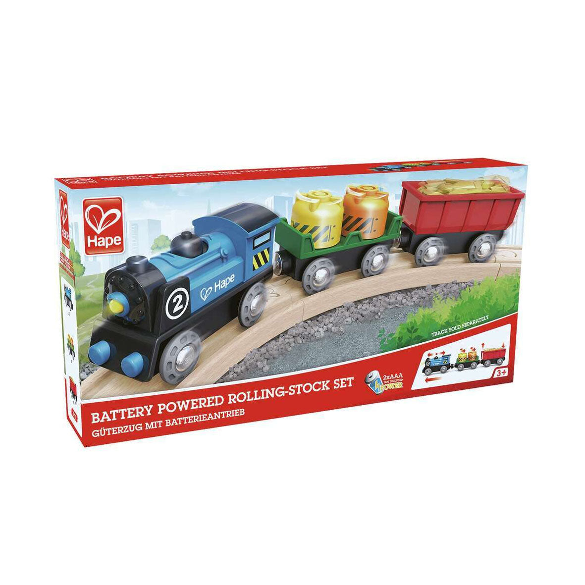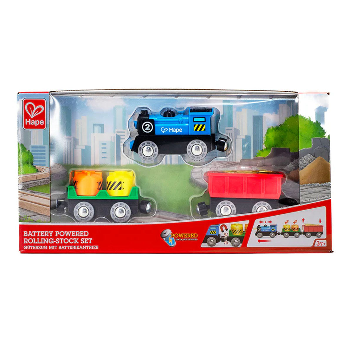 Ignite your train set with our Hape Battery Powered Rolling-Stock Set, featuring an engine with two freight wagons.