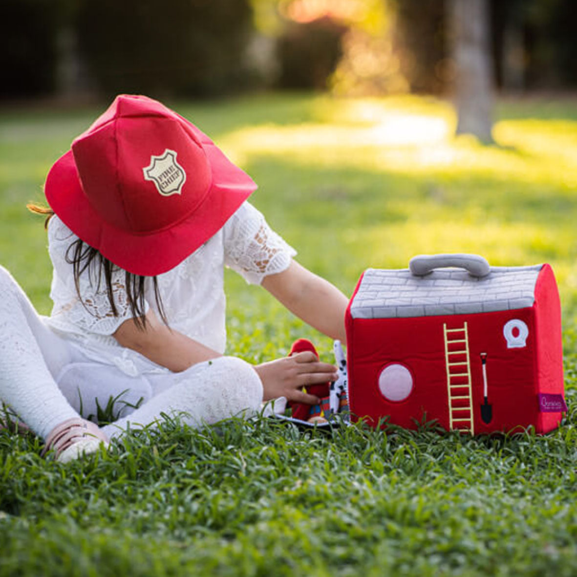 Be delighted by this adorable fabric fire station, hat and accessories by Bonikka.
