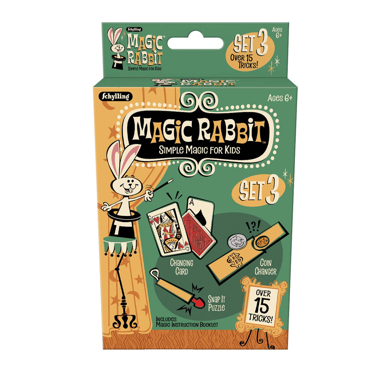The Magic Rabbit 15 Trick Sets include traditional tricks and props like the Coin Paddle, Perplexing Beads, Puzzling Boomerangs, Crystal Coin Case, the Money Tube, and more.