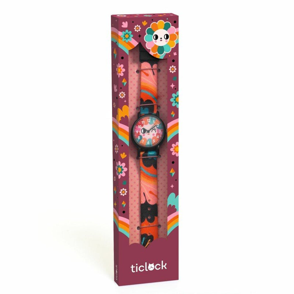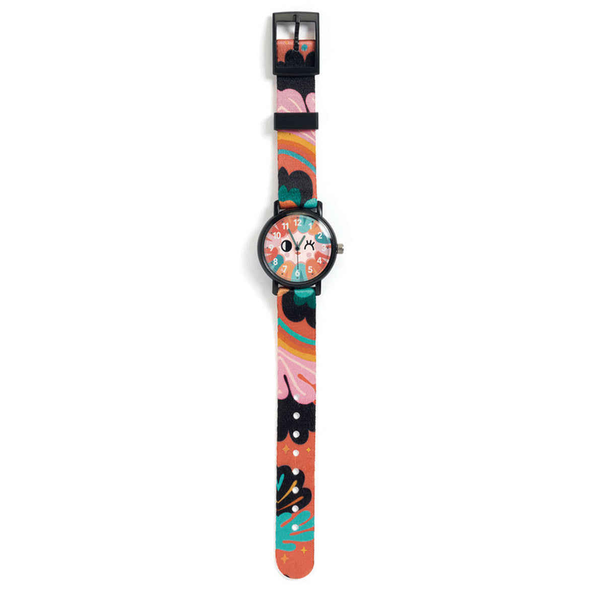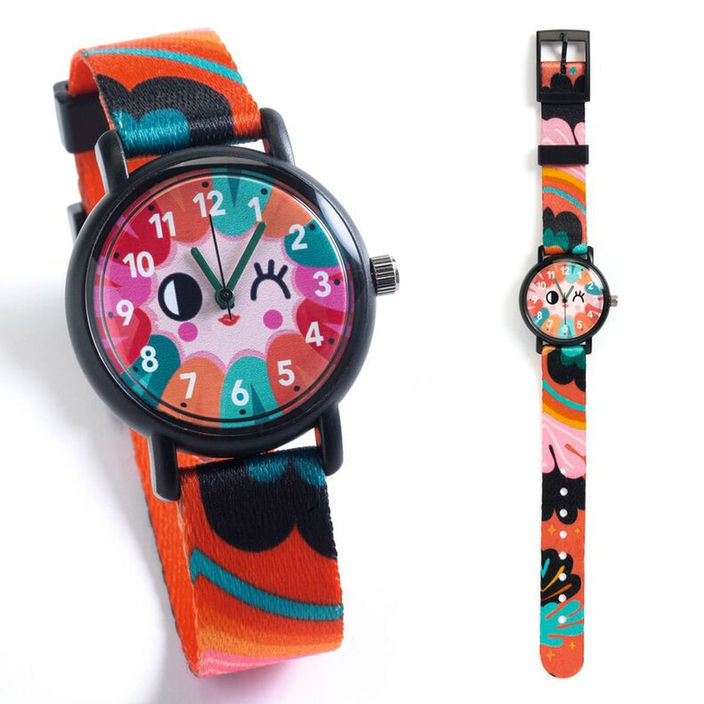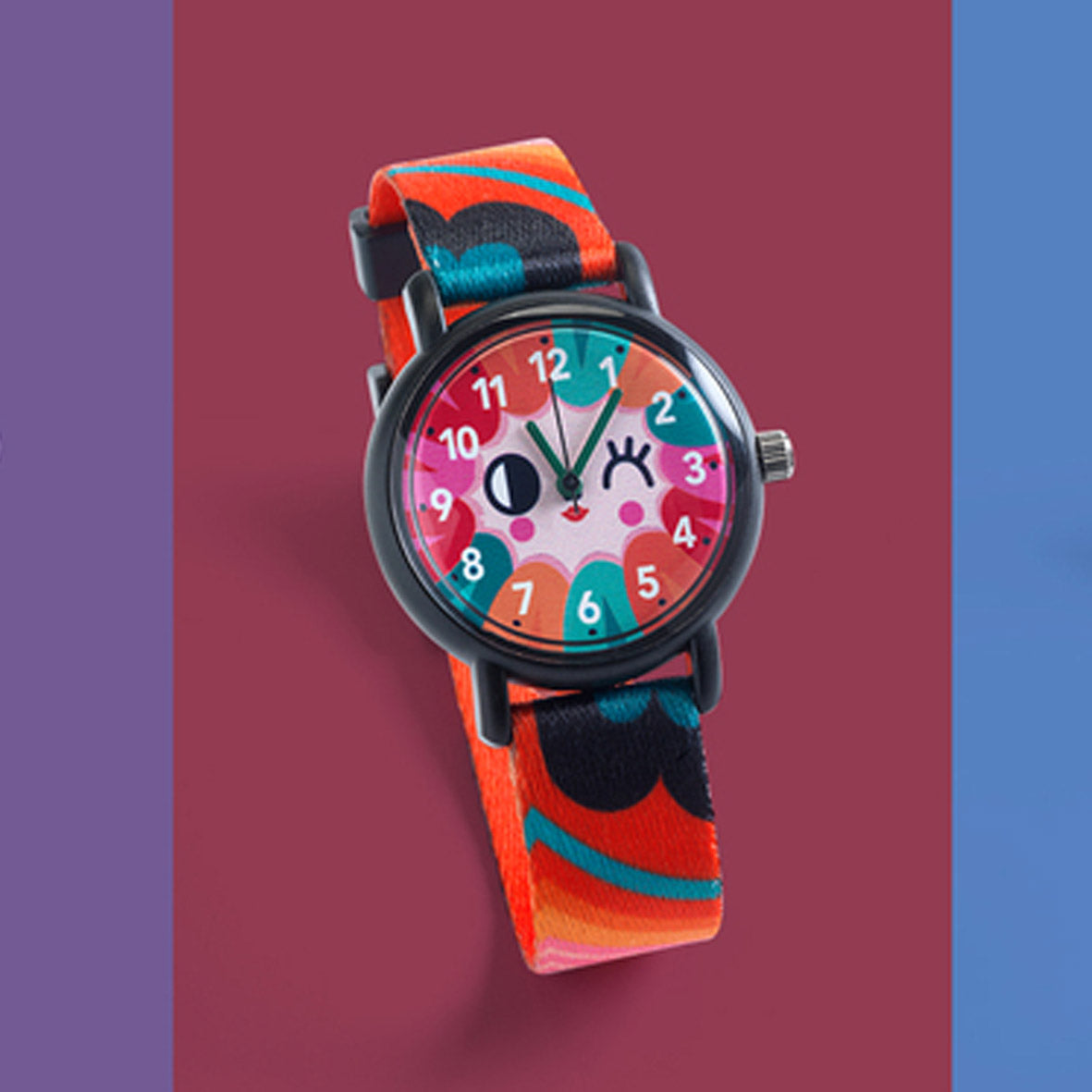 An elegant and beautifully illustrated watch in fun colours to learn to tell the time by Djeco.