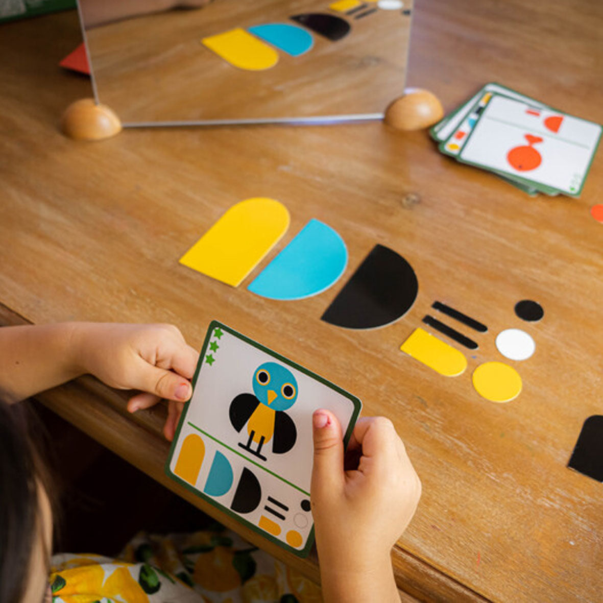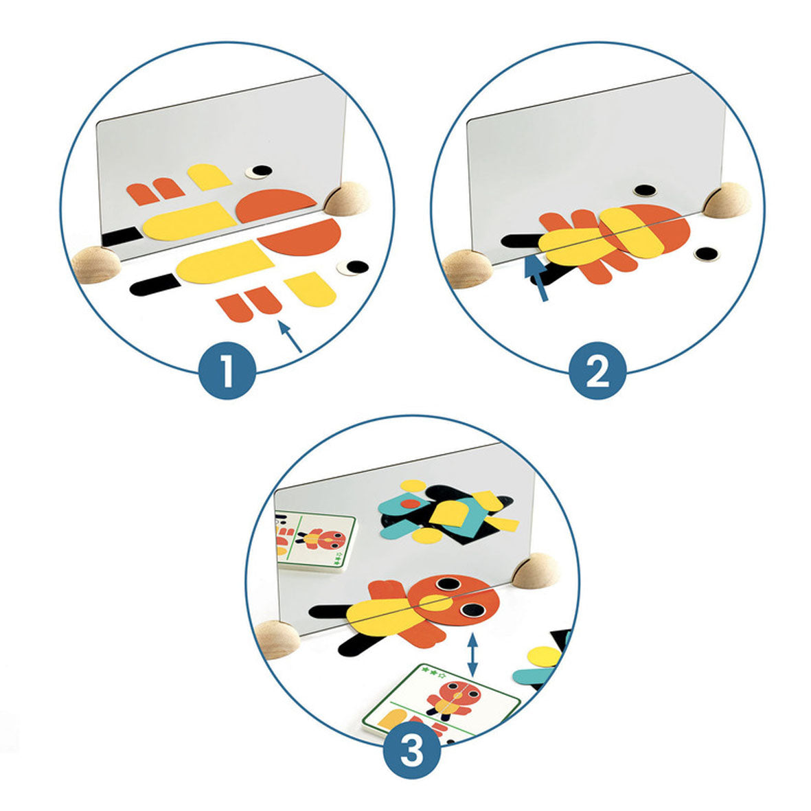 Children reproduce the funny faces that are on the example cards by sliding and superimposing the paper shapes under the mirror. Everything is transformed and images appear as if by magic!